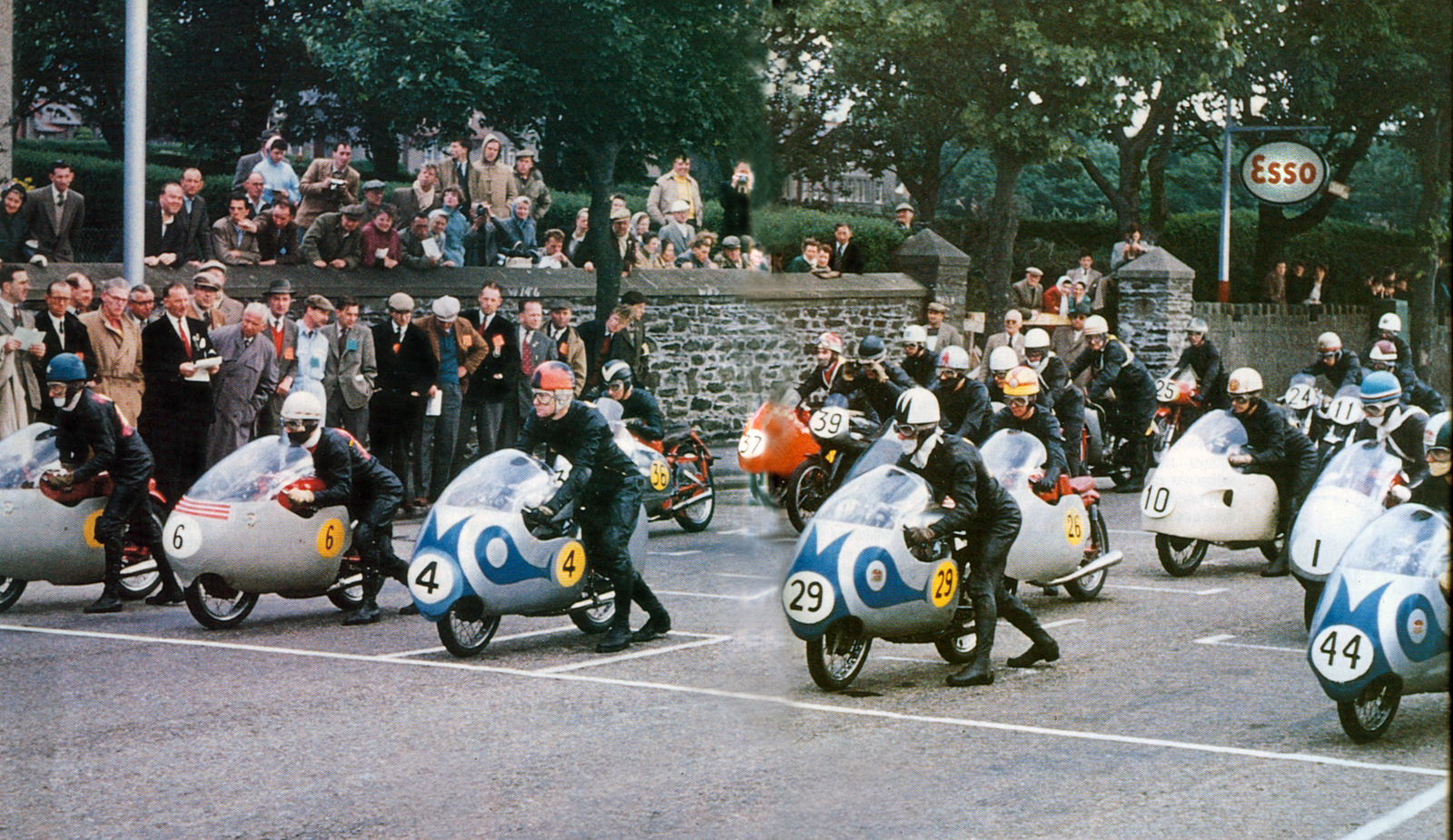 This is how looked a 125 cc Grand Prix grid in 1957: Front row, Luilike a 125ccgi Taveri (blue helmet), Carlo Ubiali (6), Sammy Miller (4), Cecil Sandford (29) and Tarquinio Provini (44); Second row, Arthur Whealler (36)