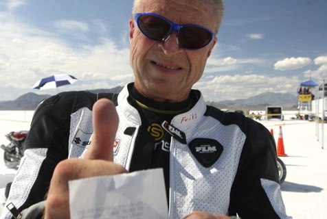 Today, Fritz works with twelve employees in Bettwil (CH) but he loves to say that his genuine passion is racing motorcycles and is part of his life. On that perspective, there is no doubt that as a pilot, he is proud of his record at Bonneville in 2009. This was achieved at the age of 72 on a Suzuki Hayabusa that Fritz prepared himself. The average speed for the round trip was 337 kph (209.44 mph) with a peak of 341 kph.