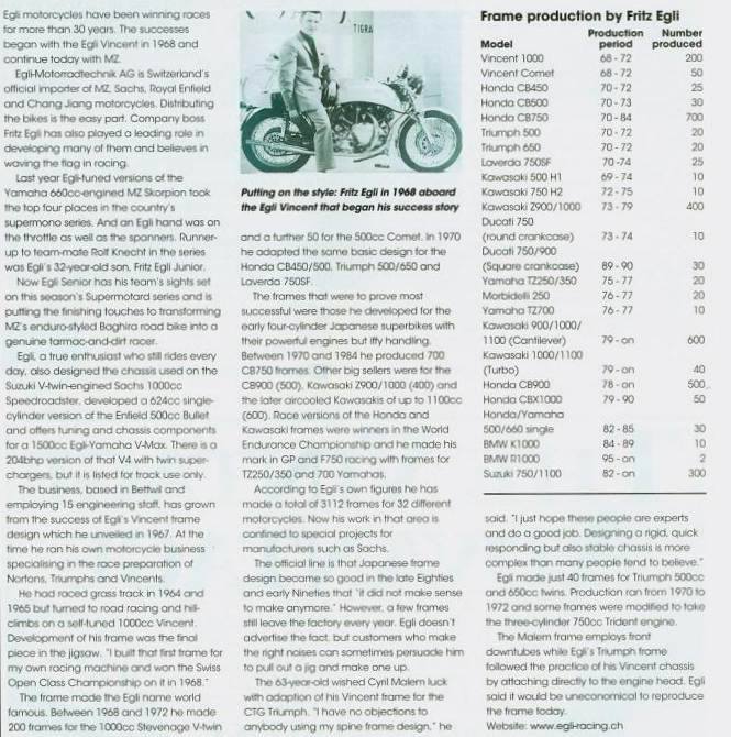 While the market for Vincent was tapering down due to the shortage of donor bikes, Fritz clearly saw the opportunity to grow his business by using the Japanese factory engines. The new superbikes had floppy frames, suspensions and brakes and the Egli recipe would fix this once for all. The Honda CB750 Four and Kawasaki 900 Z1 were the most popular but not only as more than 20 bases were repackaged in the Egli frames totaling about 3,250 units over 30 years.