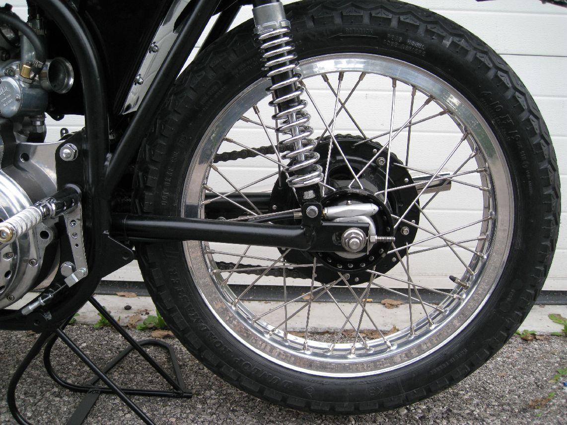 The rear hub is a Manx type with aluminum rims. The Manx hub replica can be done using a 1971 Triumph conical hub (T120 | TR6 | T150 oil in frame models). The modification consists to add holes on the periphery of the cone (you can see one of them just right to the damper).