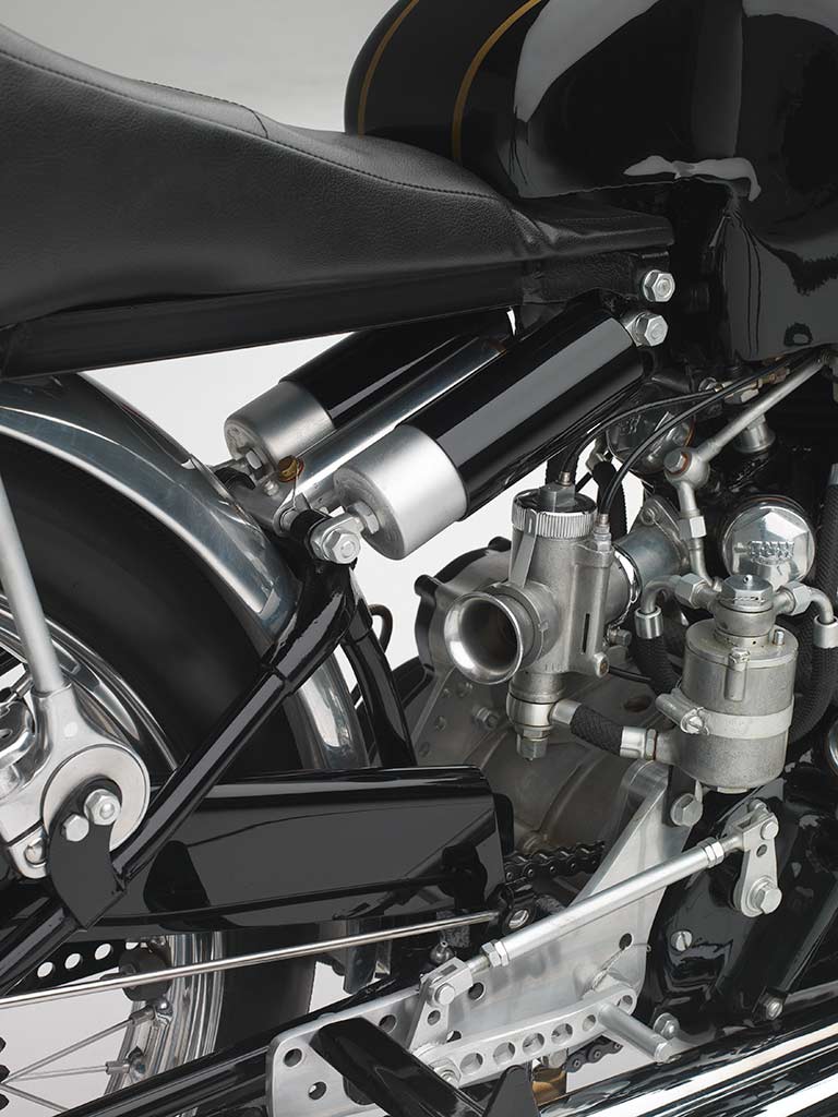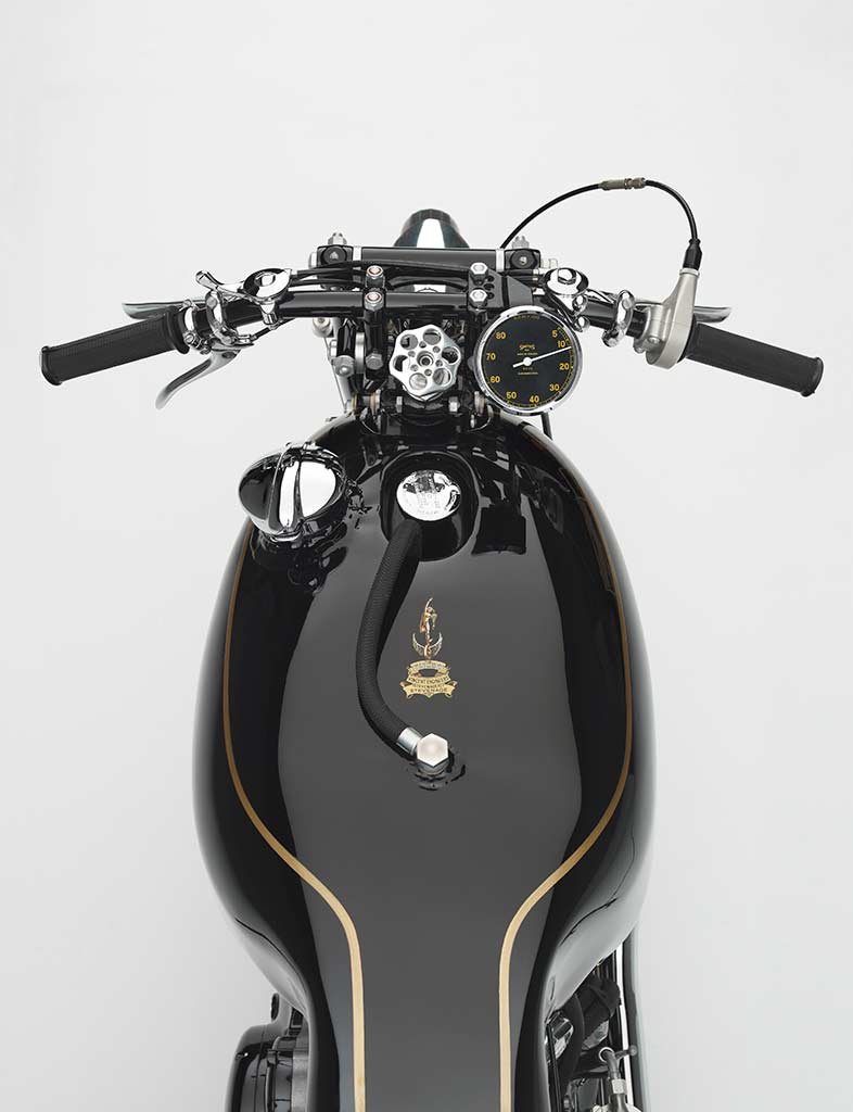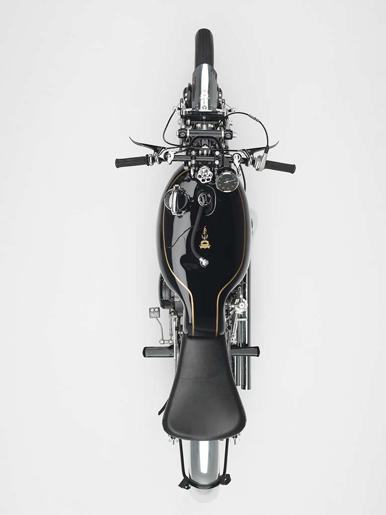 The very first key milestone involved enlarged ports, bigger carburetors, increased compression, polished con-rods and rockers, which moved the power from 45hp to 55hp; it was virtually what would become a year later the legendary Black Shadow. Historians of the brand admit that further development on this bike led to the Black Lightning specification, including the racing Mk II cams fitted on Rollie Free’s Black Shadow for the Bonneville speed records in 1948 (1).