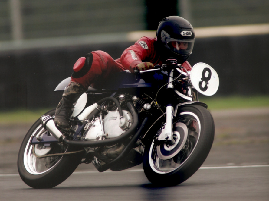 At the end of the 2000 season Anne and Barry assessed that Mark VII was getting uncompetitive but as there was so much history, tradition and sentiment attached to the bike, which had raced virtually unchanged engine wise since 1969, they agreed that doing major modifications to the engine would not be appropriate. Instead, they decided to repair the cases damaged in 1971 when the con-rod came through. Barry also agreed to make a new frame. So Mark VIII was made from scratch with a new engine including the repaired cases, modified heads and barrels to increase the displacement to 1272cc. After 6 years, the new blue Vin went on track in 2007 and during the next 2 seasons, Barry continued to improve the max. revs and speed. In 2009 (2), Barry had a serious crash with his own bike and eventually decided to retire from racing. Since, Mark VII and Mark VIII are used to parade from time to time but have not been raced since. Anne said “I still own both bikes and while I think they will not be raced again, however I never say never!”