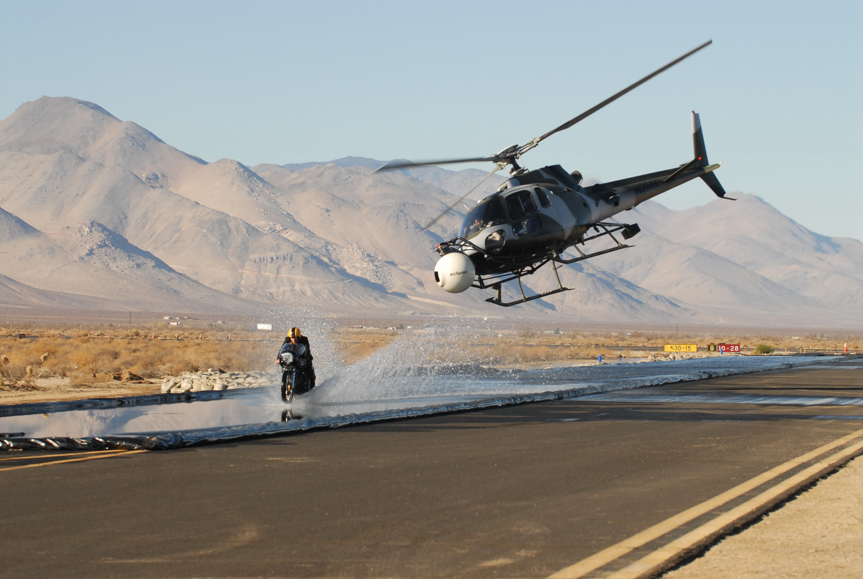 Day 2 was “the” day of the motion shooting. When Mars arrived, he noticed that the production had found in extremis a black Norton Commando to serve as a back up, “just in case”. No need to say that the stress and doubt were still there, all around the place. But that particular morning, another concern was gliding above all heads: It was freaking cold, 23⁰F or -5⁰c, and as the Porsche Cayenne camera-car had to move quite close to the bike, for safety reasons it was a “no go”. The “client” started to be worried about the consequences of a cancellation and the place was incredibly quiet in this early morning; eventually when the temperature reached 27⁰F (-3⁰c), the producer assessed that the risks were manageable and “gave a go”. The three tankers started to pour water on the runway, which had been carefully prepared and sealed to retain the 4 to 6 inches necessary so the Egli could give the impression it was flying on the water surface: The show could start, first with the Porsche Cayenne and then with the Helicopter. “The chopper was a dramatic footage and definitely the best shooting of the day. My Egli worked perfectly, despite the heavy projection of water on the engine” recalled Mars. The day went great, the Norton stayed in the shadow and everyone was happy and relieved.
