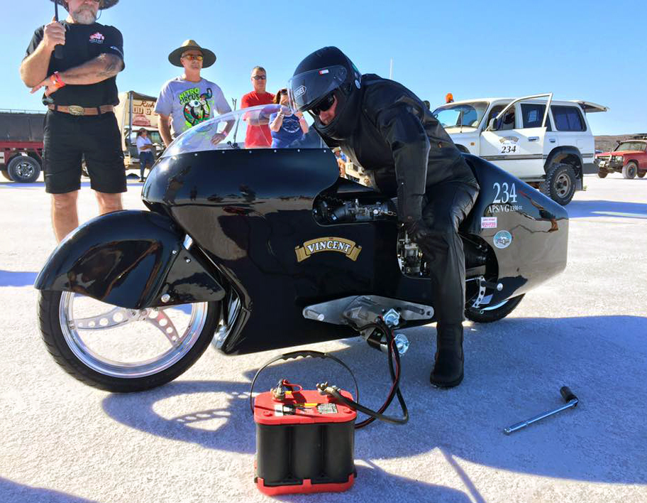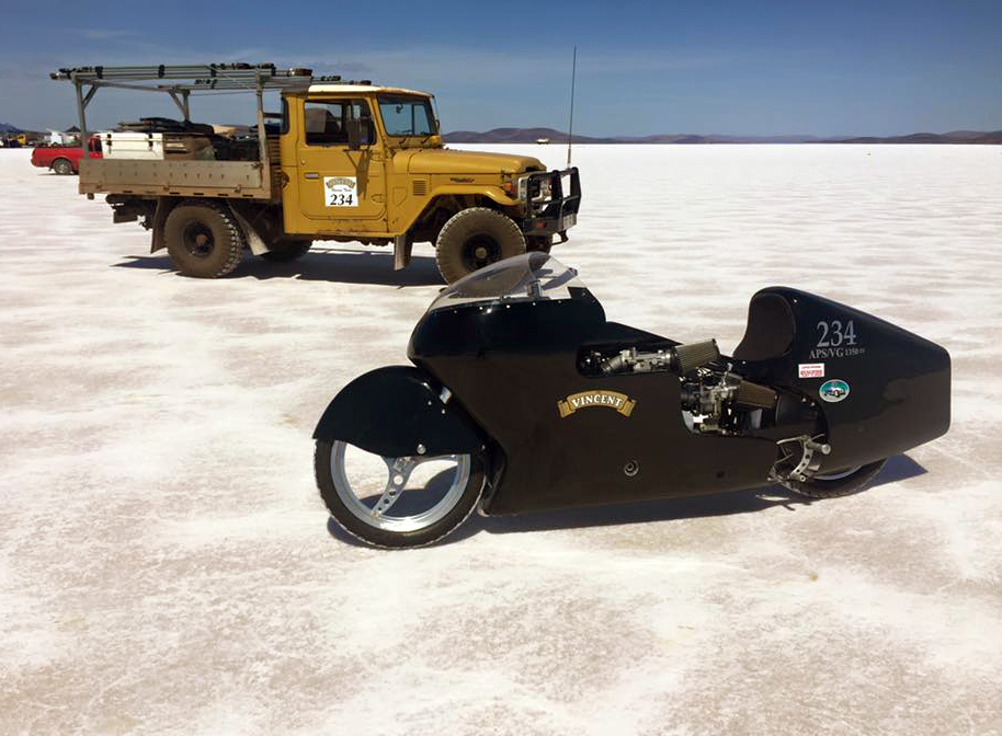 On Tuesday the wind was gusting down the track, quite strong at times so I decided to sit it out and wait for the morning which would have denser cooler air. It was a long day waiting around in the heavy heat, well above 42ºC. Friends had traveled from as far as Queensland to watch the Vincent run and I started to feel obligated to get out there but I stuck to my plan to wait it out and it paid off. The morning conditions were perfect! Cool with 2-3mph breeze straight down the track. Jetting was changed and we were blasting down the track about 8:30am. The bike just roared and revved clean to 7000 in top. It steered straight and steady. A perfect clean run. I pulled off the track near the six mile marker after slowly slowly rolling off the throttle. It’s a long, quiet wait out there until your crew arrives to hitch the bike and get you back to the pits. You are looking at their faces when they approach, do they know the speed? Why aren’t they whooping and hollering with big smiles? No speed has come through yet. We load up and head back toward the pits which is just a black spec in the distance. And then it comes through, “Bike 234, 1950 Vincent, 184?? mph congratulations!” So after years of building, modifying, chopping and changing the bike and the hundreds of hours spent in the shed working on it, it was all worth it. Very happy racers !!!!