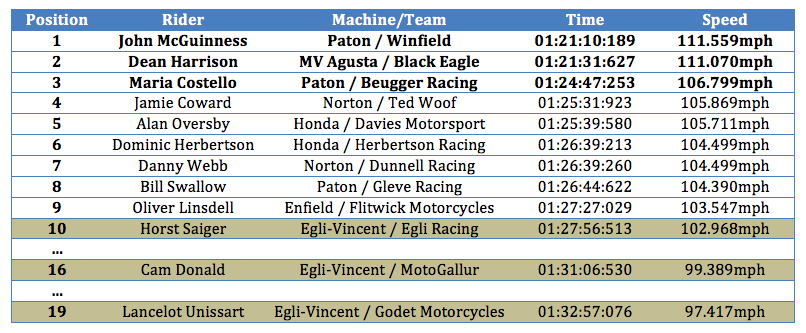 The results are nevertheless more than honorable and very encouraging and the GreyFlash continues to close the gap. Horst finished in a great 10th position (4th in his category) behind three Patons, one MV Augusta, two Hondas and 2 fast singles: Coward’s Norton and Lindsell’s Enfield. Congratulations to the Vincent boys and also to John McGuinness who won magisterially the race with his Paton at 111.559mph.
