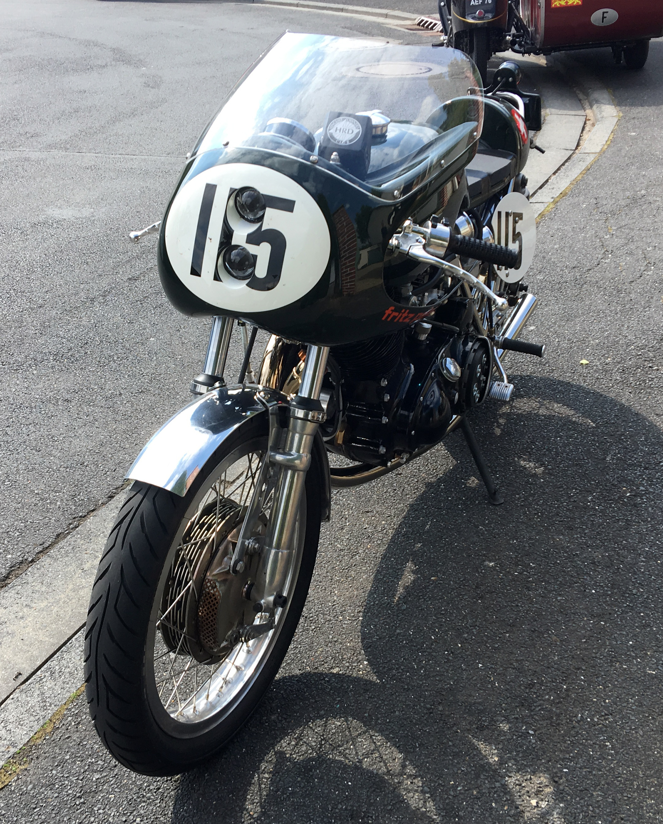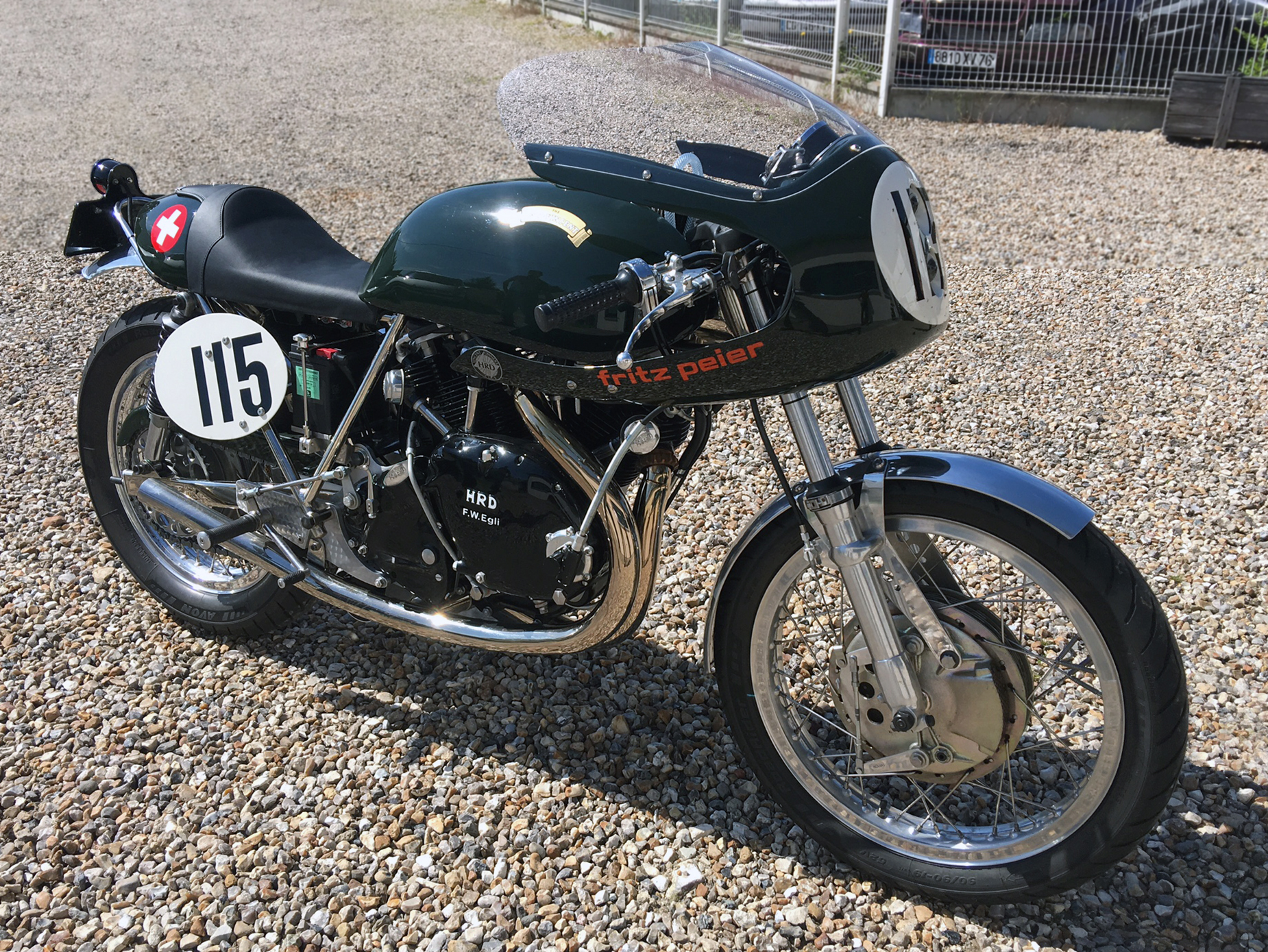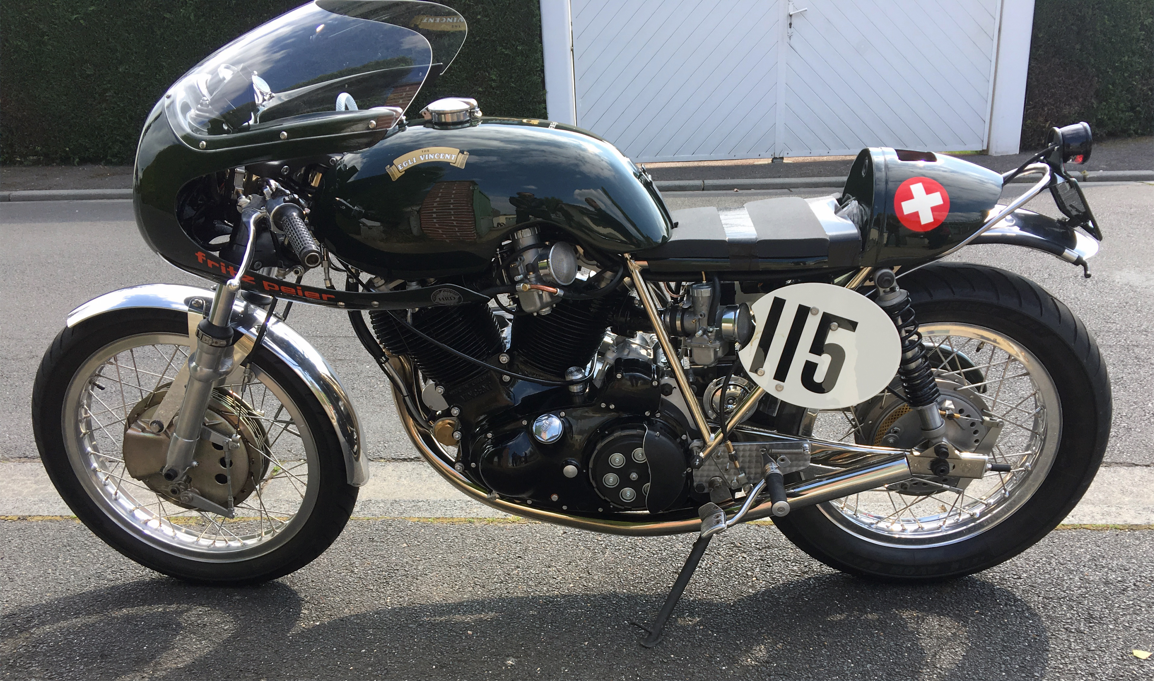 Many Egli enthusiasts also see Fritz Peier’s bike as the most resulted of all Egli-Vincent models with its redesigned tank and seat (British Racing Green of course) and the addition of the half-fairing and crossover straight exhausts. This historic bike still exists – in Germany – and is currently being restored to the original spec by his owner. This bike is the dream for many Vincent enthusiasts that led one of them to build a tribute bike with the support of Patrick Godet. Patrick is so enthusiastic by the result that he is thinking seriously to make a limited edition of five bikes to be available from 2018, just ahead of the 50 anniversary of Fritz Peier’s Swiss hillclimb title (see poll at the end of the post and give your opinion).