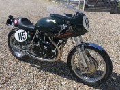 Fritz Peier’s racer in 1969: ‘Fritz Peier tank’ and racing seat painted in BRG. Half fairing and crossover straight exhaust. Engine is still a 998cc but upgraded to Lightning spec. (Photo © Rizzi)