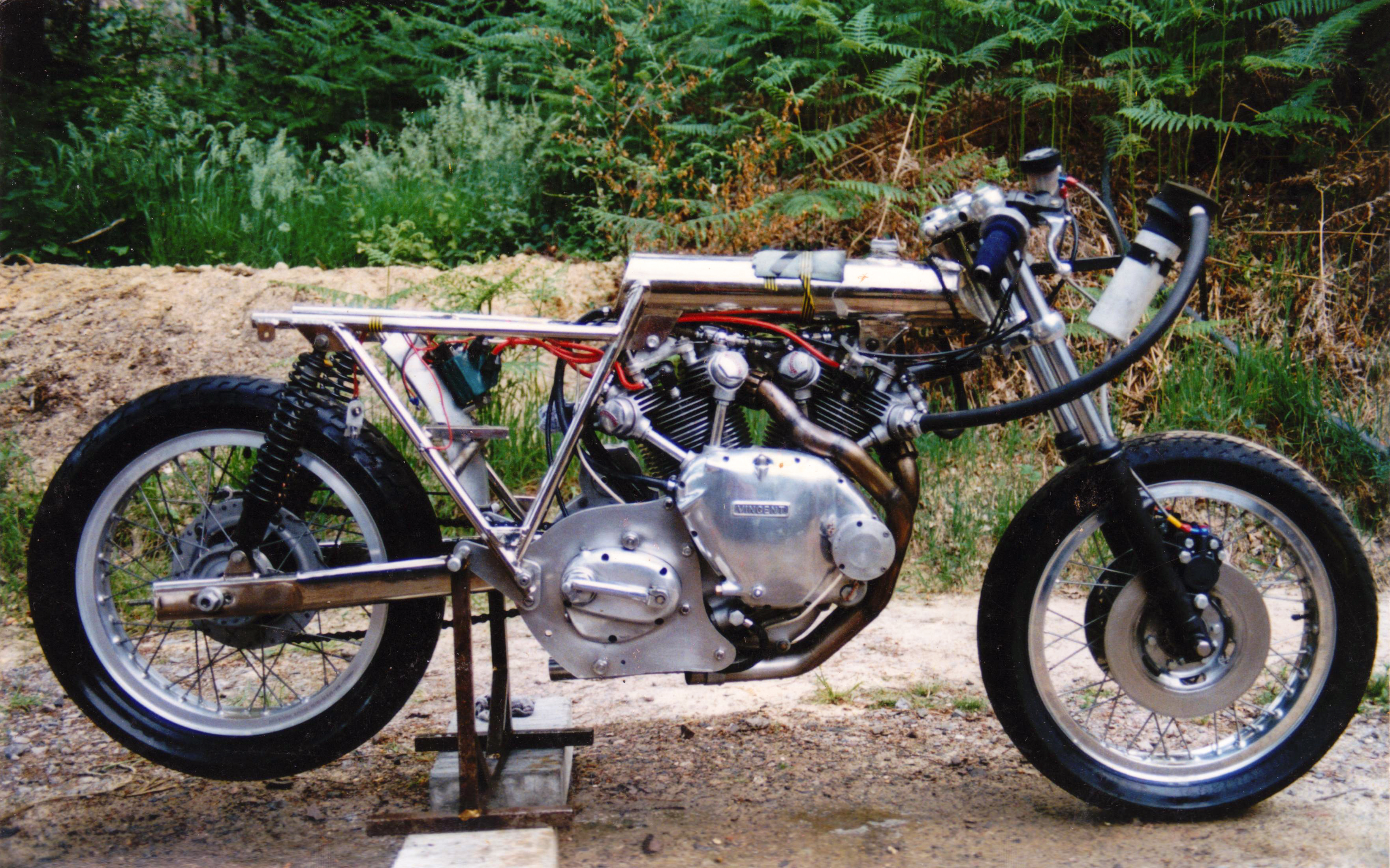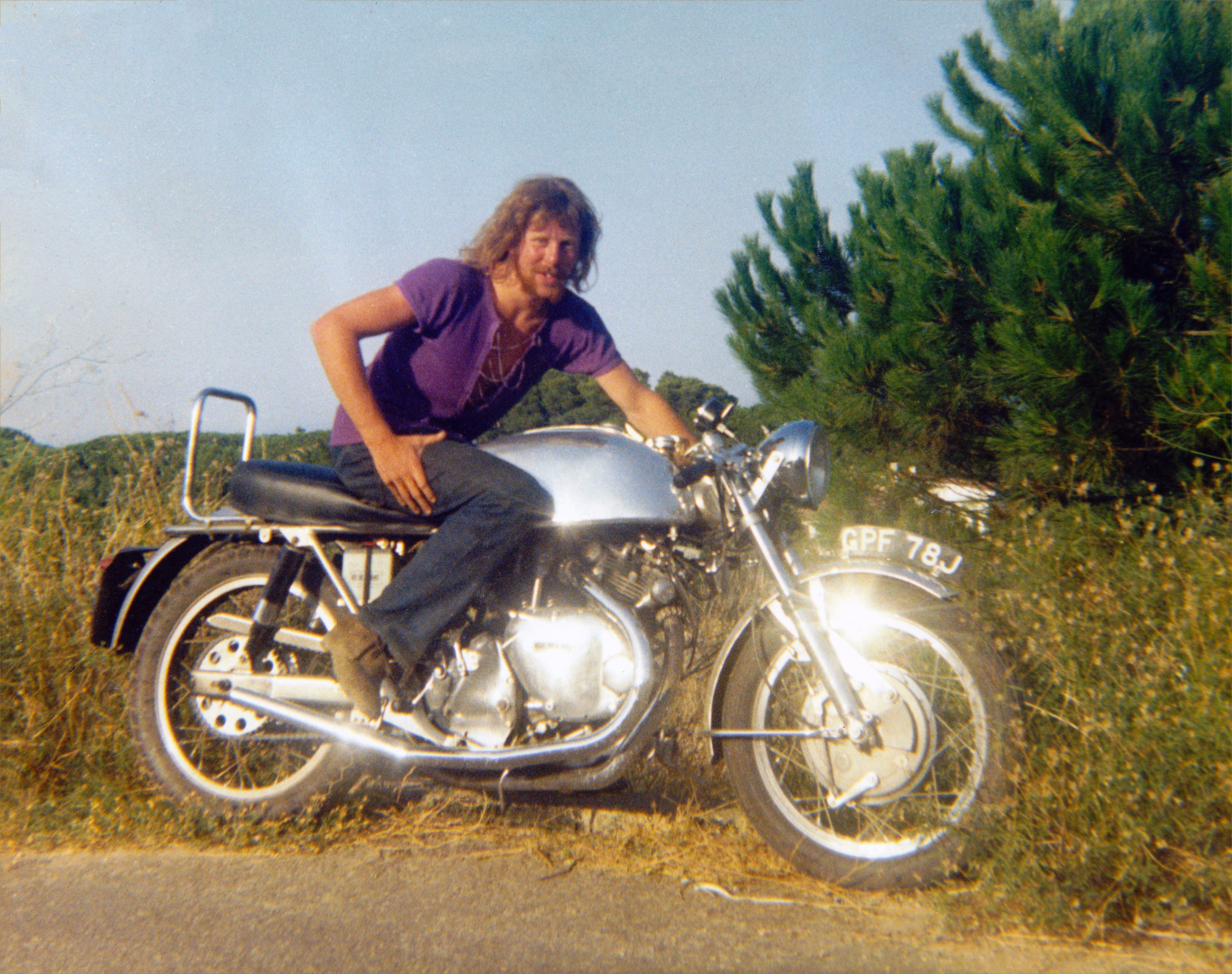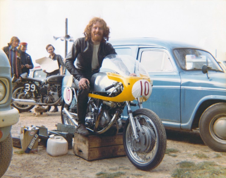 For this first summer, Mark rode to Spain and back with no major hitch and then used it regularly on the road until 1973, when he decided to convert it as a racer. “I wanted a close-ratio Manx gearbox so I swapped my original cases a first time for some totally chopped, and made up aluminum plates etc. This first try was not a very pretty affair with a messy primary chain case arrangement, …but as such I entered a few races per year, mostly Cadwell Park, testing untried modifications with of course inconsistent results. I always considered myself as a novice but I succeeded to receive my first simple club trophy in 1975”.