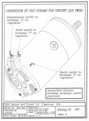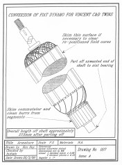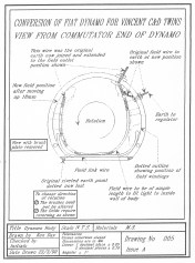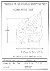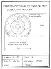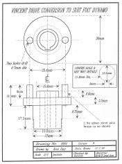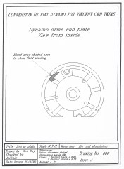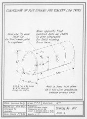 The replacement of the original Miller dynamo has been a challenge for many Vincent enthusiasts until Alton (http://alton-france.com) introduced its 12v generator designed to fit perfectly in lieu of the original Dynamo. However if you want a reliable and cheap solution, you might want to look at what many did in the 1990s, before the Alton was available. Cheap because you can find a reconditioned generator for only 150 Euros and you will just need some elbow grease to complete the kit. Ken Day – from the UK – did this conversion long ago on his personal bike, and had documented very well all the steps. He sent me his drawings with a note specifying that he was willing to share this information.