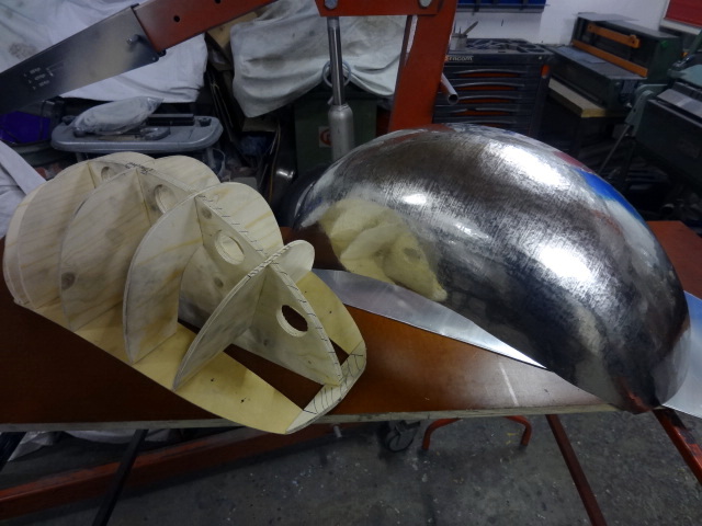 Swenchopper Kustom Bikes provided a few pictures describing the process to build this banana tank. As the finish will be polished, the surface of the tank had to be perfectly leveled with no dents that could not be hidden later with some filler. The craftsman was Laurent Jeanmonot from Gost kustom. He built it from pictures and drawing supplied by Fritz Egli, Swen was speechless when he saw the result!