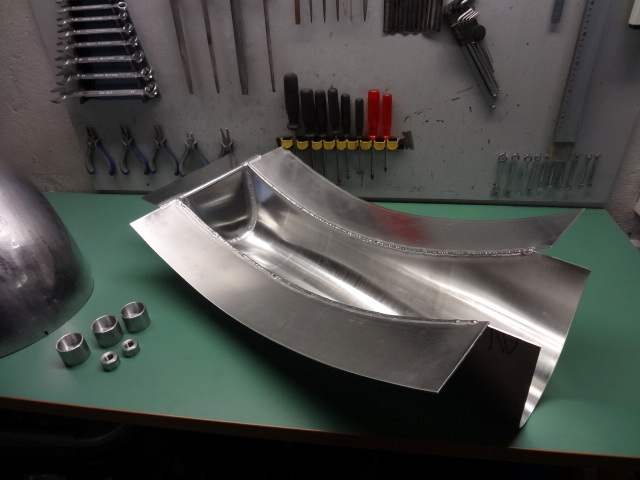 Everything starts here, from flat aluminum sheets that were cut based on the pattern.Then count long, long hours of forming with a mallet and a bench or a Chinese wheel which is a great tool, but you get the point, unless you learnt this process and practiced it, you are likely to end up with a nervous breakdown before long….The two upper half are perfectly shaped to the form.The two upper half are then welded together by the inside. Note the lip on the top that will be grinded in the next step.The pattern and the upper tank. Some craftsmen use a styrofoam form instead.Now it’s time to think about the bottom of the tank to fit the spine frame and the curves of the engine.All these subcomponents are positioned with jigs and welded together.The result after the welding operation, note on the left the sockets that will be used for the gas cap and taps and the silent blocks.The top and the bottom are now positioned together, ready to be welded.the last welding operation will be the triangulated U-shape that you see on the right side, which goes around the oil filler of the spine frame.Fully welded, leak-proofed and polished. Ready to fit the EgliNow fitted on the bike.