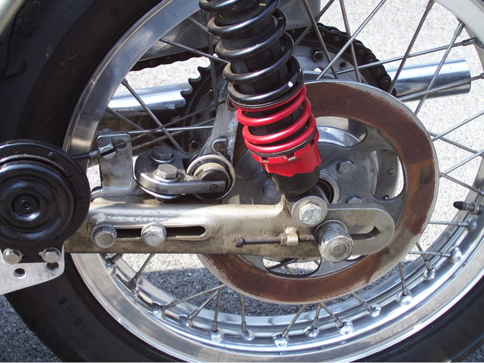 Photo of the rear Campagnolo mechanical single disc. The disc can be positioned on the disc by the two bolts through the swing arm on the left. Often owners extend or add welds to the lever arm to get better braking. Credit: David Dunfey
